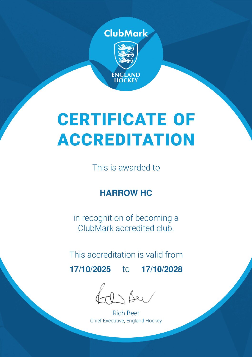 Harrow Hockey Club is proud to have achieved England Hockey ClubMark accreditation. This is the nationally recognised standard for sports clubs, certifying that we provide a safe, well-managed, and high-quality environment for all our members.